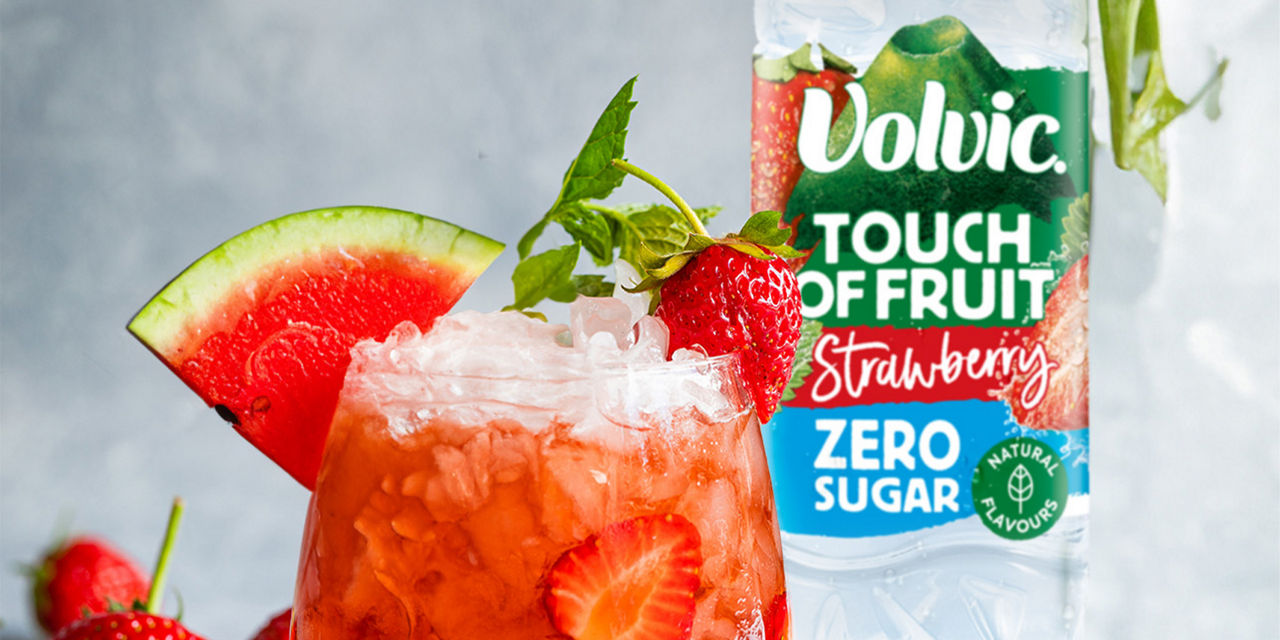- Ajoutez le Volvic Touch of Fruit Fraise, le jus de pastèque et la menthe fraîche.