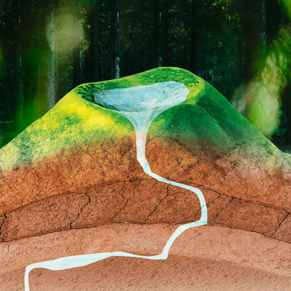 Le parcours de l’eau minérale naturelle Volvic commence avec les eaux de pluie et de fonte des neiges qui tombent sur l’impluvium. Ensuite, lors de son cheminement souterrain, l'eau Volvic s’écoule à travers 6 couches de roches volcaniques pendant près de 5 ans. Filtrée par ces couches volcaniques, elle est naturellement protégée de toute activité humaine.