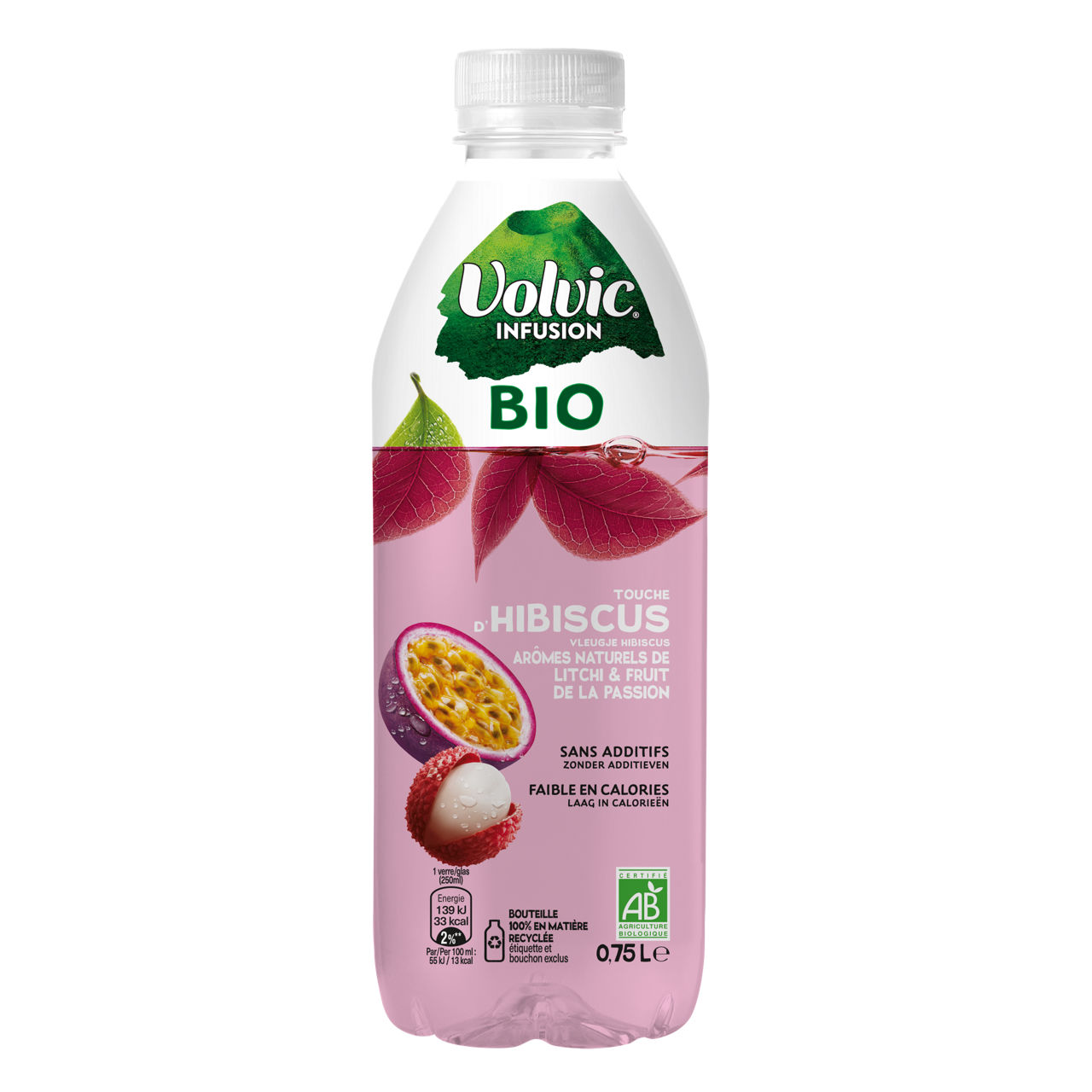 Volvic natuurlijk mineraalwater (95,1%), biologische suiker (3%), biologisch citroensap uit concentraat (1,6%), biologische hibiscusinfusie (0,09%), natuurlijke lychee-smaak, natuurlijke passievrucht-smaak, biologische paarse wortelconcentraat